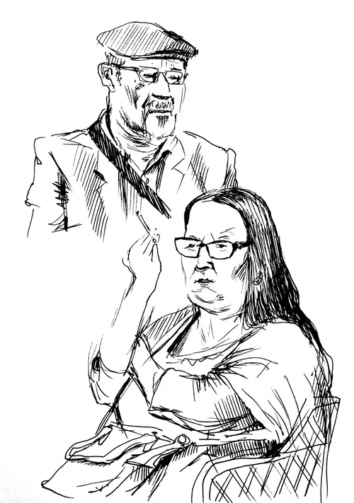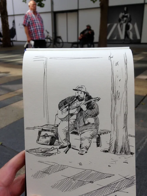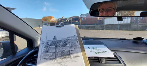 Jeg kører rundt i byen, indtil jeg finder et godt motiv, parkerer og tegner enten siddende i bilen eller stående udenfor, alt efter vejret. Når det er koldt, er jeg afhængig af, jeg kan parkere foran motivet og sidde i bilen og tegne. Det kan tage noget tid at finde det rigtige sted, for det perfekte motiv har sjældent en parkeringsplads foran sig. Hvis det er for mørkt at tegne udenfor, tegner jeg indendørs på cafeer og i hallen.